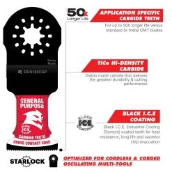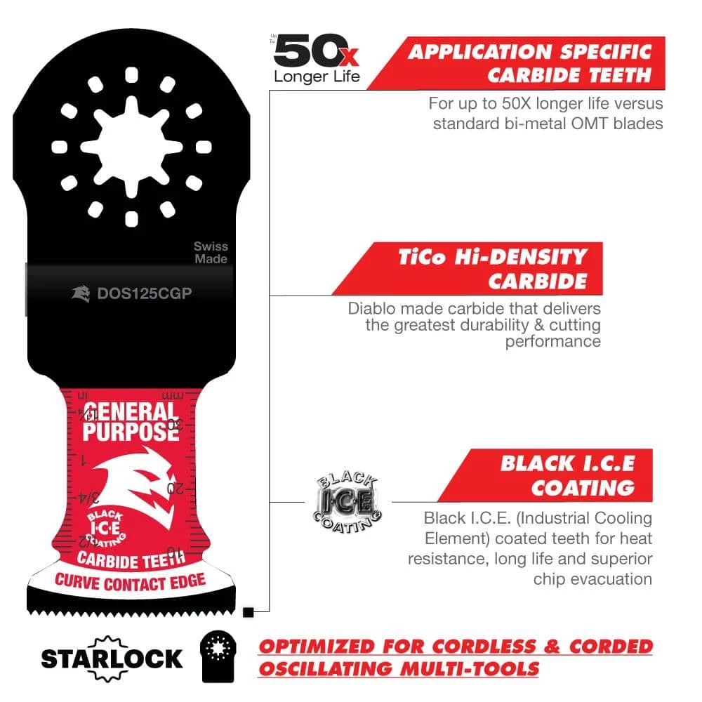 Diablo’s Starlock carbide oscillating blades feature application specific designs that deliver extreme durability and superior cutting life in general purpose cuts: nail-embedded wood, clean wood, metal and plastics. High-performance carbide teeth deliver an unmatched up to 50X longer cutting life versus standard bi-metal blades. Curve contact edge creates a pilot for precise, clean plunge cuts with less vibration. An optimized blade design and Black I.C.E. (Industrial Cooling Element) keeps the teeth cool and build up free for fast, clean cuts. Tool free quick-change interface fits Fein and other Starlock tools, also compatible with non-Starlock multi-tools.