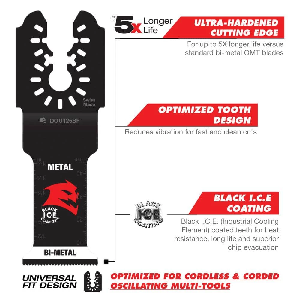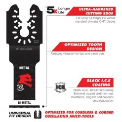 Diablo’s universal fit bi-metal oscillating blades feature application specific designs that deliver maximum durability and longer life in metal. These high-performance blades feature an ultra-hardened cutting edge to deliver up to 5X longer life than standard blades. An optimized tooth design reduces vibration for fast and clean cuts. Black I.C.E. (Industrial Cooling Element) keeps the teeth cool and build up free for fast, clean cuts. The blade’s universal fit, adapter-free design easily attaches most tools, with the exception of Starlock tools.