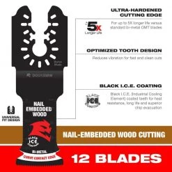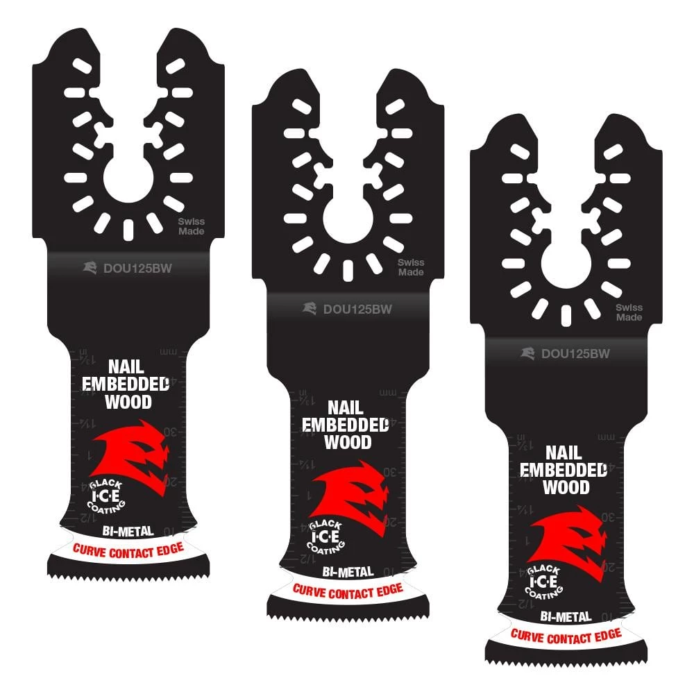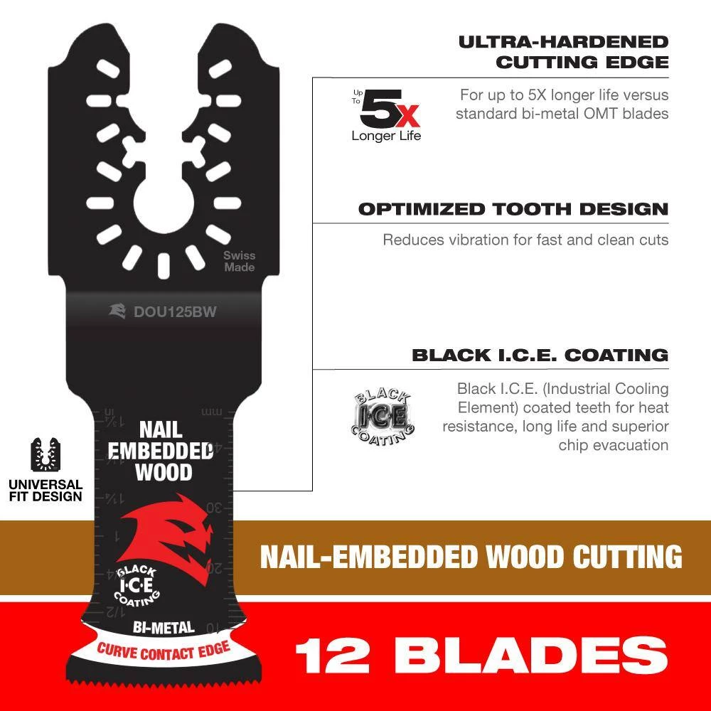 Diablo universal fit bi-metal oscillating blades feature application specific designs that deliver maximum durability and longer life in nail-embedded wood applications. These high-performance blades feature an ultra-hardened cutting edge to deliver up to 5X longer life than standard blades. Curve contact edge creates a pilot for precise, clean plunge cuts with less vibration. Black I.C.E. (Industrial Cooling Element) keeps the teeth cool and build up free for fast, clean cuts. The blade’s universal fit, adapter-free design easily attaches most tools, with the exception of Starlock tools.