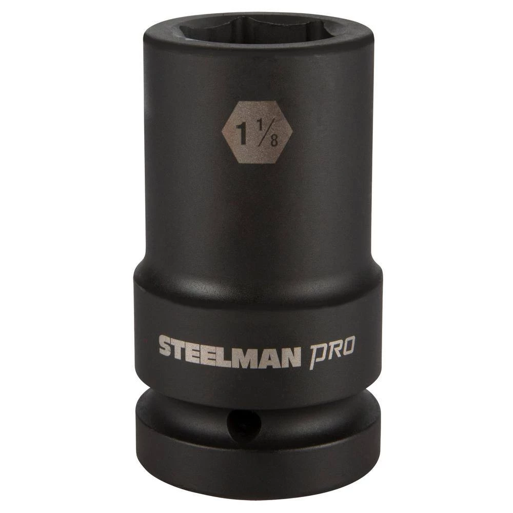 Every mechanic knows that having a reliable set of tools can make your life easier when working on heavy-duty vehicles and equipment. The Steelman PRO 79340 1 in. Drive 6-Point 1-1/8 in. Thin Wall Deep Impact Socket is ideal for use in performing maintenance, repairs and service on large trucks and tractor trailers, farming equipment and tractors, oilfield and construction equipment, and mass transit vehicles. Made from drop forged and heat treated chromoly steel, this socket features a ball detent recess on the 1 in. drive end to help hold it securely onto ratchets, air wrenches, adapters, and extensions. The 6-point shape grips the sides of fasteners and not the corners, reducing wear and the chance of rounding the fastener and the thin walled, deep well design allows easy reach of nuts on extended threads and recessed bolts even when they are in tight areas, too narrow for regular sockets. The socket features a rust and corrosion resistant black phosphate protective coating with laser etched size callouts and markings. Rated to withstand up to 150% of ASME torque requirements for impact tools, this socket can handle tough use in any professional shop / garage, home workshop, or on the work site.