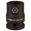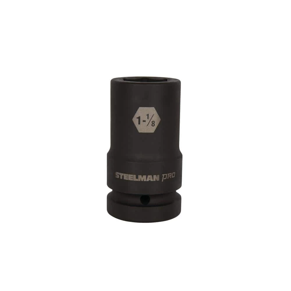 Every mechanic knows that having a reliable set of tools can make your life easier when working on heavy-duty vehicles and equipment. The Steelman PRO 79397 1 in. Drive x 1-1/8 in. 6-Point Deep Impact Socket is ideal for use in performing maintenance, repairs and service on large trucks and tractor trailers, farming equipment and tractors, oilfield and construction equipment, and mass transit vehicles. Made from drop forged and heat treated chromoly steel, this socket features a ball detent recess on the 1 in. drive end to help hold it securely onto ratchets, air wrenches, adapters, and extensions. The 6-point shape grips the sides of fasteners and not the corners, reducing wear and the chance of rounding the fastener and the deep well design allows easy reach of nuts on extended threads and recessed bolts. The socket features a rust and corrosion resistant black phosphate protective coating with laser etched size callouts and markings. Rated to withstand up to 150% of ASME torque requirements for impact tools, this socket can handle tough use in any professional shop / garage, home workshop, or on the work site.