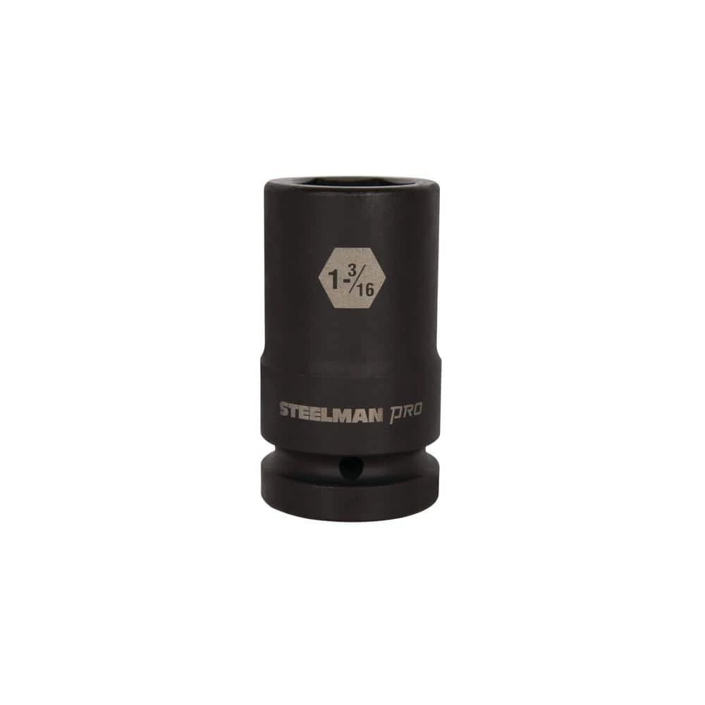 Every mechanic knows that having a reliable set of tools can make your life easier when working on heavy-duty vehicles and equipment. The Steelman PRO 79396 1 in. Drive x 1-3/16 in. 6-Point Deep Impact Socket is ideal for use in performing maintenance, repairs and service on large trucks and tractor trailers, farming equipment and tractors, oilfield and construction equipment, and mass transit vehicles. Made from drop forged and heat treated chromoly steel, this socket features a ball detent recess on the 1 in. drive end to help hold it securely onto ratchets, air wrenches, adapters, and extensions. The 6-point shape grips the sides of fasteners and not the corners, reducing wear and the chance of rounding the fastener and the deep well design allows easy reach of nuts on extended threads and recessed bolts. The socket features a rust and corrosion resistant black phosphate protective coating with laser etched size callouts and markings. Rated to withstand up to 150% of ASME torque requirements for impact tools, this socket can handle tough use in any professional shop / garage, home workshop, or on the work site.