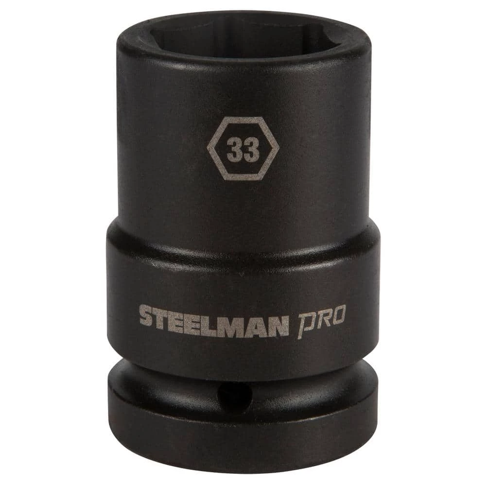Every mechanic knows that having a reliable set of tools can make your life easier when working on heavy-duty vehicles and equipment. The Steelman PRO 79353 1 in. Drive x 33mm 6-Point Thin Wall Deep Impact Socket is ideal for use in performing maintenance, repairs and service on large trucks and tractor trailers, farming equipment and tractors, oilfield and construction equipment, and mass transit vehicles. Made from drop forged and heat treated chromoly steel, this socket features a ball detent recess on the 1 in. drive end to help hold it securely onto ratchets, air wrenches, adapters, and extensions. The 6-point shape grips the sides of fasteners and not the corners, reducing wear and the chance of rounding the fastener and the thin walled, deep well design allows easy reach of nuts on extended threads and recessed bolts even when they are in tight areas, too narrow for regular sockets. The socket features a rust and corrosion resistant black phosphate protective coating with laser etched size callouts and markings. Rated to withstand up to 150% of ASME torque requirements for impact tools, this socket can handle tough use in any professional shop / garage, home workshop, or on the work site.