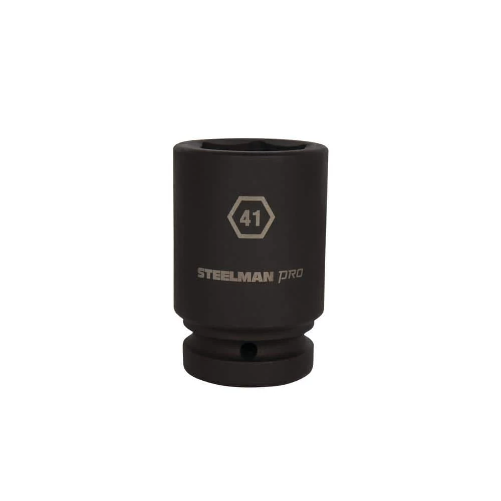 Every mechanic knows that having a reliable set of tools can make your life easier when working on heavy-duty vehicles and equipment. The Steelman PRO 79393 1 in. Drive x 41 mm 6-Point Deep Impact Socket is ideal for use in performing maintenance, repairs and service on large trucks and tractor trailers, farming equipment and tractors, oilfield and construction equipment, and mass transit vehicles. Made from drop forged and heat treated chromoly steel, this socket features a ball detent recess on the 1 in. drive end to help hold it securely onto ratchets, air wrenches, adapters, and extensions. The 6-point shape grips the sides of fasteners and not the corners, reducing wear and the chance of rounding the fastener and the deep well design allows easy reach of nuts on extended threads and recessed bolts. The socket features a rust and corrosion resistant black phosphate protective coating with laser etched size callouts and markings. Rated to withstand up to 150% of ASME torque requirements for impact tools, this socket can handle tough use in any professional shop / garage, home workshop, or on the work site.