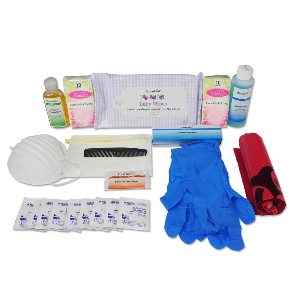 - 1 basic hygiene kit, 3 wet naps and 1-pack of wipes in soft dispenser