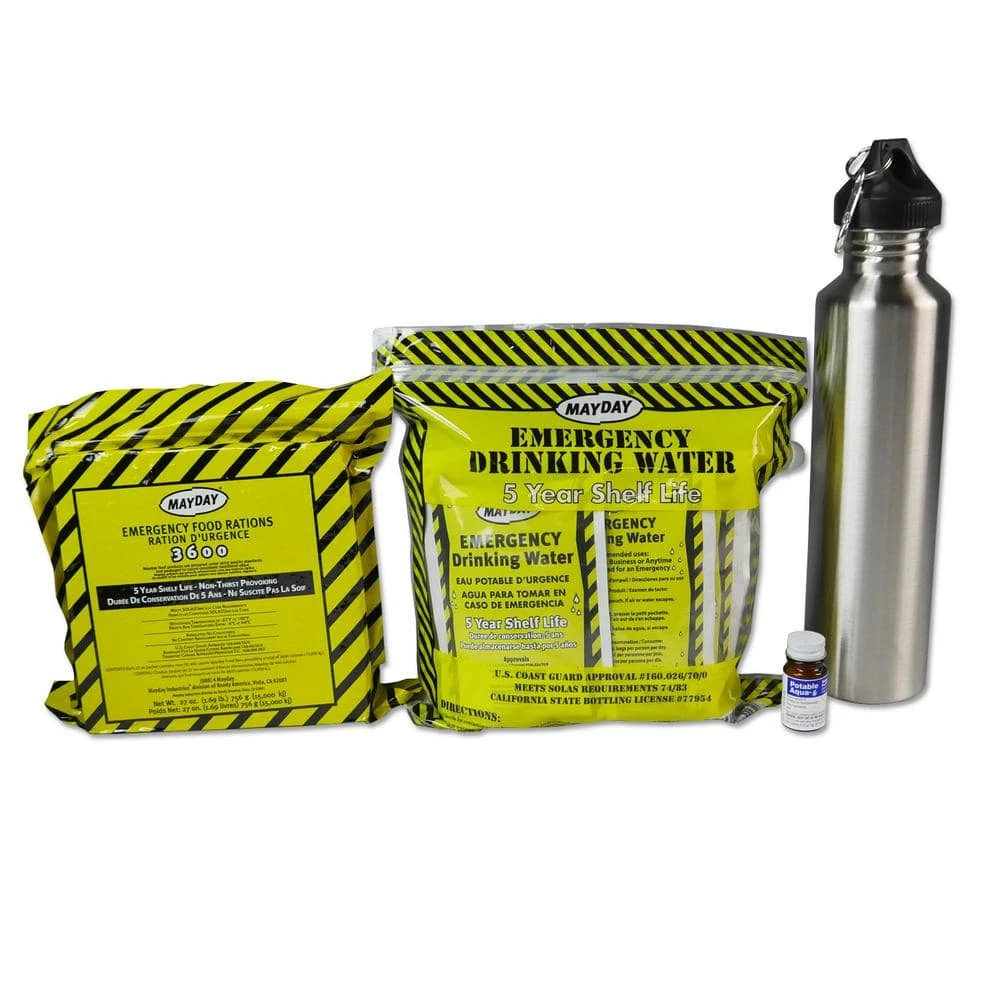 - Contains one 3600 calorie food bar and nine 4.225 oz. water pouches, each with a 5-year shelf life