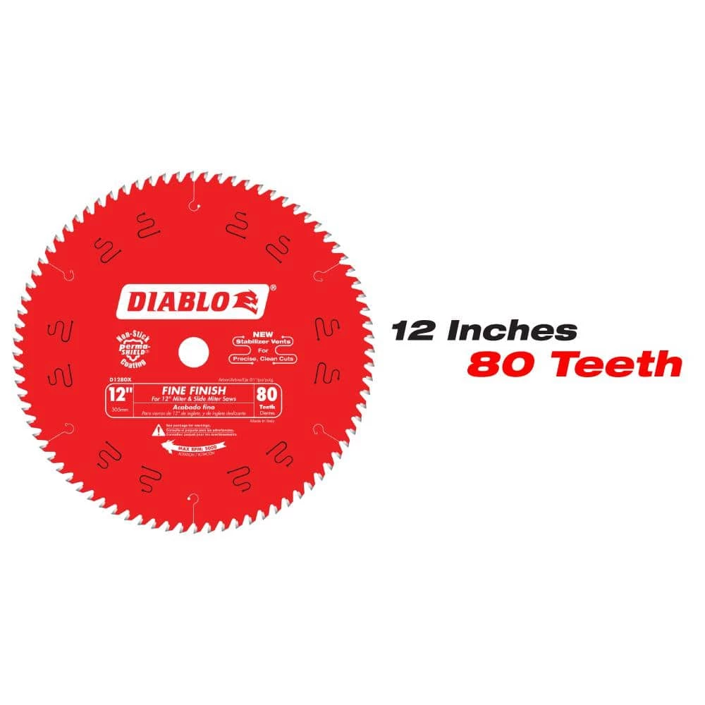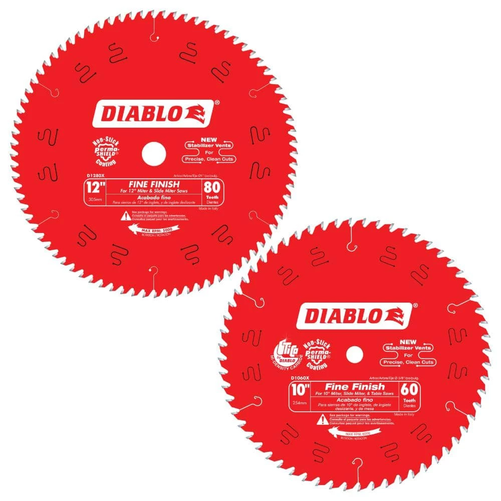 Diablo’s next generation 10 in. x 60-Tooth Fine Finish Carbide Circular Saw Blade and 12 in. x 80 Tooth Fine Finish Carbide Circular Saw Blade features new laser-cut stabilizer vents for precise and clean cuts in a variety of wood materials. The advanced stabilizer vents feature a permanent filler baked in from top to bottom for absorbing noise and preventing sideways movement, allowing the blade to slice through wood cleanly, quickly and accurately. Constructed with TiCo Hi-Density special-blend carbide, The blades produces precise cuts and provides 5 X longer cutting life. The laser cut heat expansion slots allow the blade to expand and contract during use, keeping the cut true and straight. These blades are excellent for trim work and projects such as building bookcases, cabinets and shelving. Use the 10 in. in miter saws, slide miter saws and table saws, use the 12 in. in miter saws and slide miter saws.