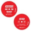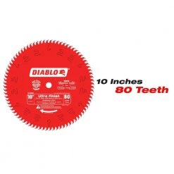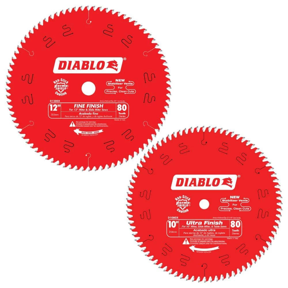 Diablo’s next generation 10 in. x 80 Tooth Ultra Finish Carbide Circular Saw Blade and 12 in. x 80 Tooth Fine Finish Carbide Circular Saw Blade feature new laser-cut stabilizer vents for precise and clean cuts in a variety of wood materials. The advanced stabilizer vents feature a permanent filler baked in from top to bottom for absorbing noise and preventing sideways movement, allowing the blade to slice through wood cleanly, quickly and accurately. Constructed with TiCo Hi-Density special-blend carbide, Diablo’s 10 in. ultra-finish blade and 12 in. fine finish blade produce precise cuts and provide 5 X longer cutting life. The laser cut heat expansion slots allow the blades to expand and contract during use, keeping the cut true and straight. The 10 in. blade is excellent for projects such as cutting fine molding and double-sided veneered plywood for cabinets and furniture. The 12 in. blade is excellent for trim work and projects such as building bookcases, cabinets and shelving.