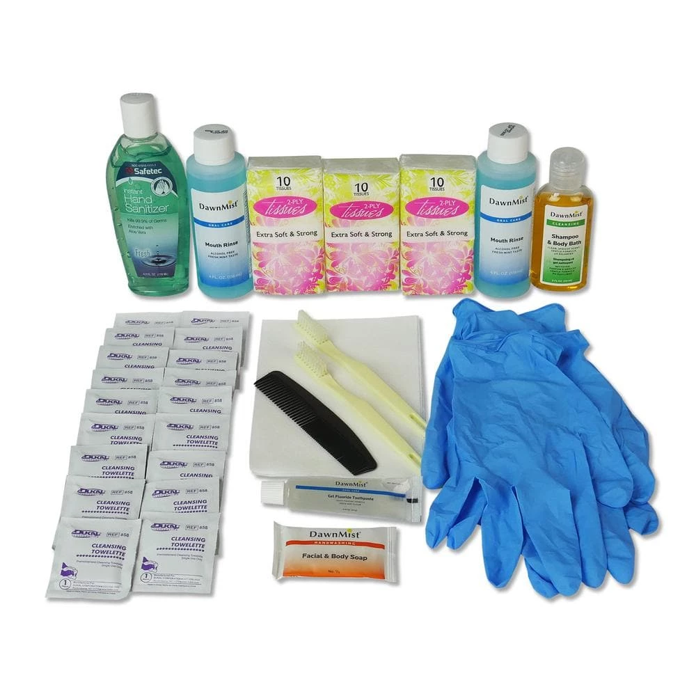 - Four 10 in. nitrile gloves and 2 niosh N-95 approved dust mask