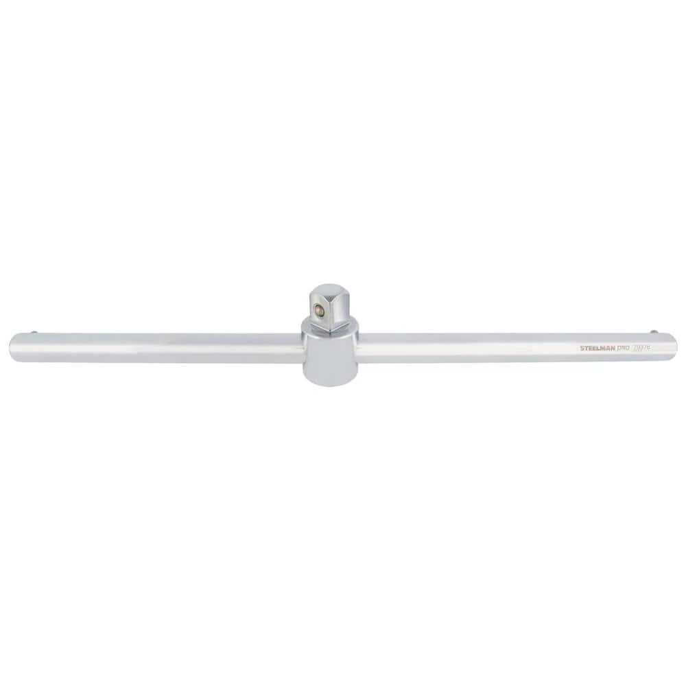 Heavy-duty jobs call for heavy-duty tools. The STEELMAN PRO 79378 3/4 in. Drive x 17.75 in. L Sliding T-Bar is made for tough jobs that demand the most of you and your tools. Ideal for use in performing maintenance, repairs and service on large trucks and trailers, farming equipment and tractors, oilfield and construction equipment, mass transit vehicles and similar projects, this durable tool is forged from resilient chrome-vanadium steel to endure a lifetime of long use. The sliding head has a male 3/4 in. drive end that fits any 3/4 in. drive socket, extension and adapter while allowing you to use the tool with either the fast driving benefit of a T-handle or the high torque delivering power of a 17-3/4 in. L breaker bar. Spring-loaded detent balls on the ends of the handle hold the head securely in place during breaker use and a similar detent ball on the head holds tight to attached sockets and accessories. The tool features a rust and corrosion resistant polished chrome finish that is easy to wipe clean when oily or soiled.
