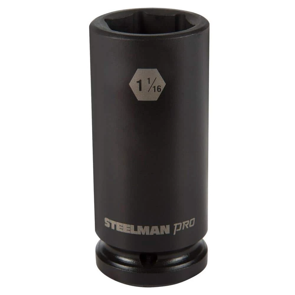 Every mechanic knows that having a reliable set of tools can make your life easier when working on heavy-duty vehicles and equipment. The Steelman PRO 79347 3/4 in. Drive x 1-1/16 in. 6-Point Thin Wall Deep Impact Socket is ideal for use in performing maintenance, repairs and service on large trucks and tractor trailers, farming equipment and tractors, oilfield and construction equipment, and mass transit vehicles. Made from drop forged and heat treated chromoly steel, this socket features a ball detent recess on the 3/4 in. drive end to help hold it securely onto ratchets, air wrenches, adapters, and extensions. The 6-point shape grips the sides of fasteners and not the corners, reducing wear and the chance of rounding the fastener and the thin walled, deep well design allows easy reach of nuts on extended threads and recessed bolts even when they are in tight areas, too narrow for regular sockets. The socket features a rust and corrosion resistant black phosphate protective coating with laser etched size callouts and markings. Rated to withstand up to 150% of ASME torque requirements for impact tools, this socket can handle tough use in any professional shop / garage, home workshop, or on the work site.
