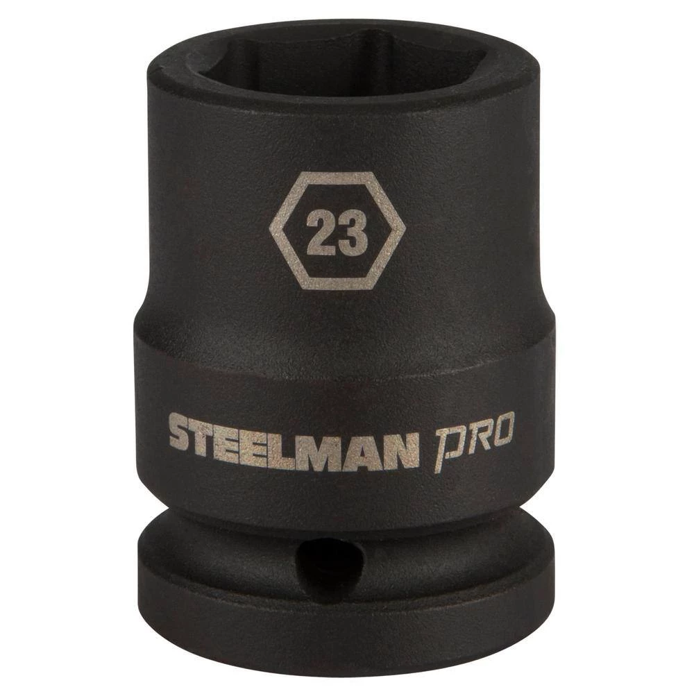 Every mechanic knows that having a reliable set of tools can make your life easier when working on heavy-duty vehicles and equipment. The Steelman PRO 79362 3/4 in. Drive x 23 mm 6-Point Impact Socket is ideal for use in performing maintenance, repairs and service on large trucks and tractor trailers, farming equipment and tractors, oilfield and construction equipment, and mass transit vehicles. Made from drop forged and heat treated chromoly steel, this socket features a ball detent recess on the 3/4 in. drive end to help hold it securely onto ratchets, air wrenches, adapters, and extensions. The 6-point design grips the sides of fasteners and not the corners, reducing wear and the chance of rounding the fastener. The socket features a rust and corrosion resistant black phosphate protective coating with laser etched size callouts and markings. Rated to withstand up to 150% of ASME torque requirements for impact tools, this socket can handle tough use in any professional shop / garage, home workshop, or on the work site.