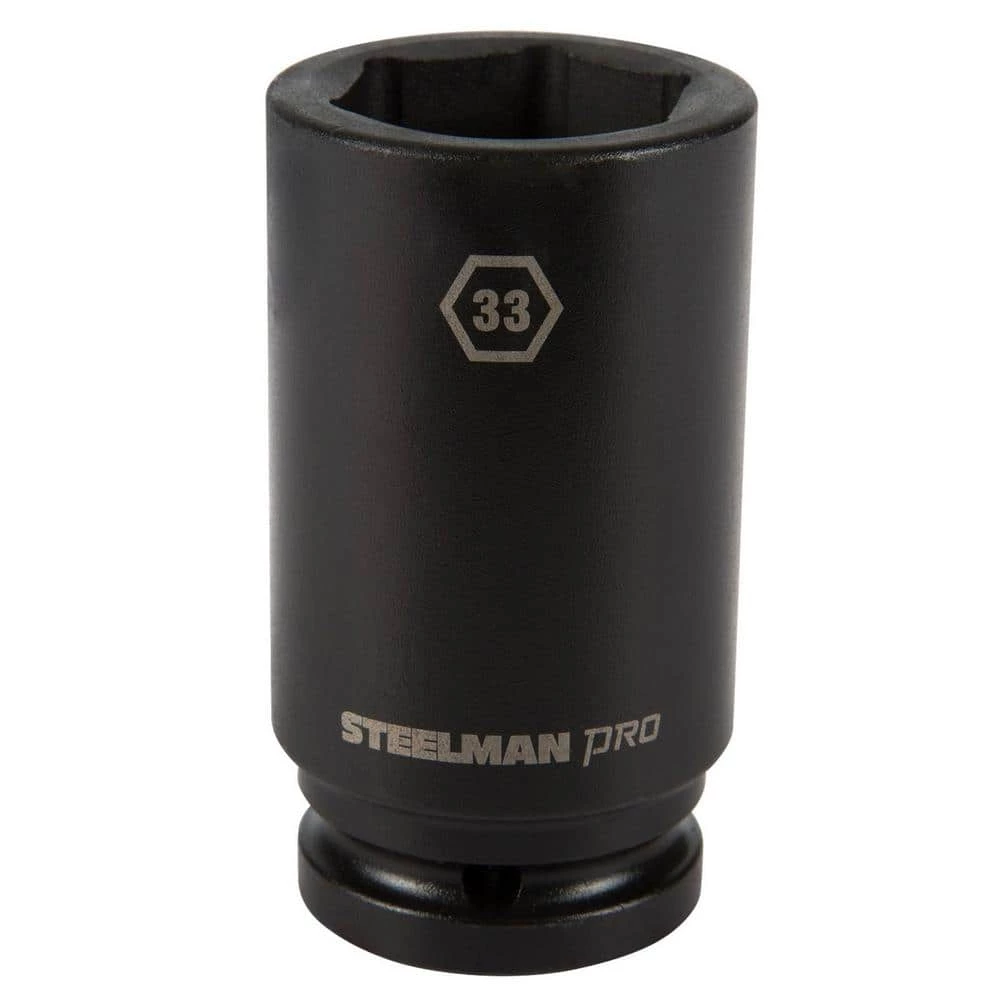 Every mechanic knows that having a reliable set of tools can make your life easier when working on heavy-duty vehicles and equipment. The STEELMAN PRO 79344 3/4-Inch Drive x 33mm 6-Point Deep Impact Socket is ideal for use in performing maintenance, repairs and service on large trucks and tractor trailers, farming equipment and tractors, oilfield and construction equipment, and mass transit vehicles. Made from drop forged and heat treated chromoly steel, this socket features a ball detent recess on the 3/4-inch drive end to help hold it securely onto ratchets, air wrenches, adapters, and extensions. The 6-point shape grips the sides of fasteners and not the corners, reducing wear and the chance of rounding the fastener and the deep well design allows easy reach of nuts on extended threads and recessed bolts. The socket features a rust and corrosion resistant black phosphate protective coating with laser etched size callouts and markings. Rated to withstand up to 150% of ASME torque requirements for impact tools, this socket can handle tough use in any professional shop / garage, home workshop, or on the work site.
