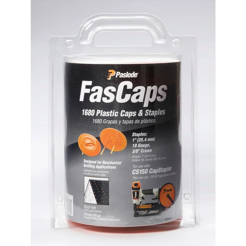 FasCaps Plastic Caps and Staples are designed for residential building applications. They have greater holding power and prevent tearing. Caps provide water tight seal per MFG specification. Use with Paslode Cap Stapler.