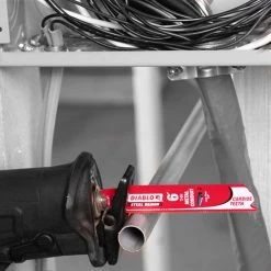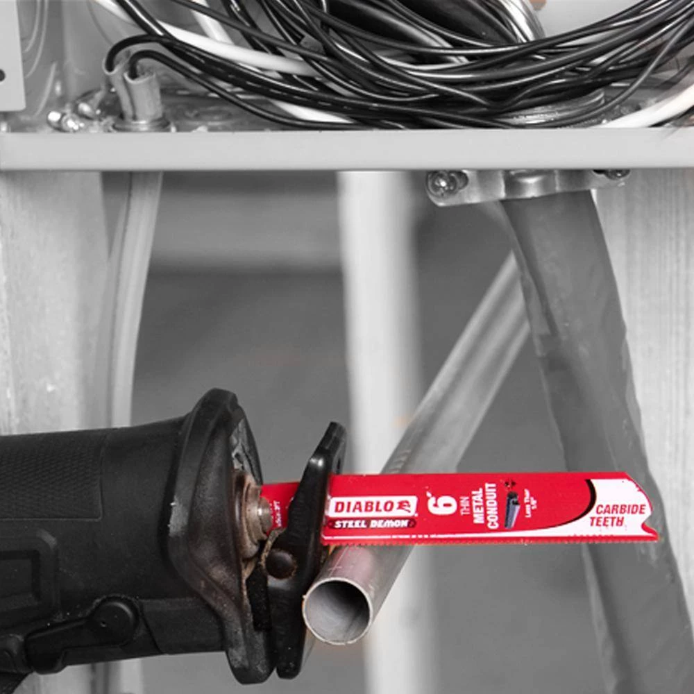 Diablo’s Steel Demon 6 in. Carbide Tipped Blades for Thin Metal Conduit, Medium Metal (1/16 in. to 5/16 in.) and Thick Metal (3/16 in. to 9/16 in.) include exclusive features that deliver an unmatched up to 50X L life than standard bi-metal blades. The Carbide Thin Metal Conduit feature an optimized tooth count that effortlessly rips through thin metals with ease, producing clean cuts that require virtually no rework. The carbide Medium Metal Blades ’ 10 TPI provides cleaner/smoother cuts in metal, while the increased blade body height produces straighter cuts with less vibration. The Carbide Thick Metal Blades are designed for extreme metal cutting, including high strength alloys, cast iron and stainless steel. All blades feature Perma-Shield non-stick coating for less gumming and friction.