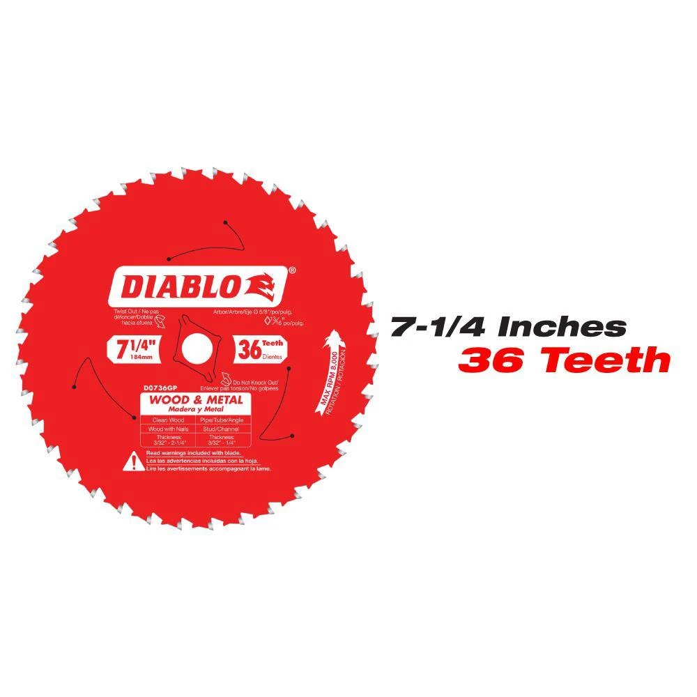 - 7-1/4 in. x 36-tooth cuts up to 2-1/4 in. material thickness in clean wood and wood with nail cutting application