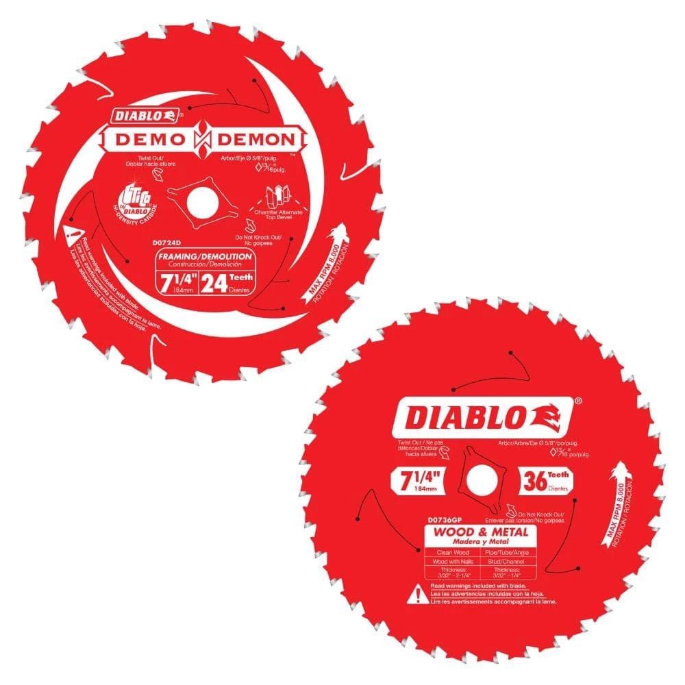 Diablo’s Demo Demon Ultimate Framing and Demolition saw blade offers up to 10 times cutting performance in intense applications. This 7-1/4 in. 24-tooth blade includes a new industry-first tooth grind sequence, Tracking Point Amped that is specifically designed to provide extreme durability and effortless cuts, even when cutting abrasive materials such as shingles, bolts or nail-embedded wood. Diablos 7-1/4 in. Wood and Metal saw blade is the industry’s first multi-purpose saw blade for cutting clean wood and wood with nails, up to 2-1/4 in. material thickness and metal ranging from 3/32 in. to 1/4 in. wall thickness and -1 Dia. The versatility of these new blades provides the ability to use the same blade to cut wood and metal so now users can focus on completing the job more efficiently rather than wasting time with changing tools and saw blades.
