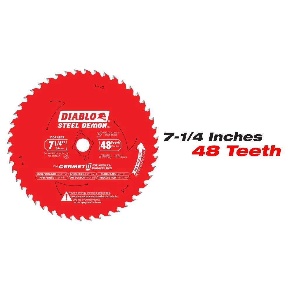 - 7-1/4 in. x 48-tooth blade cuts up to 2-1/4 in. material thickness in clean wood and wood with nail cutting applications