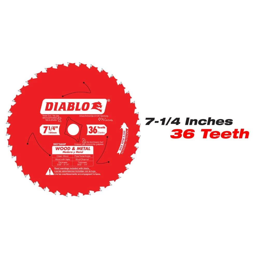 - 7-1/4 in. x 36-tooth cuts up to 2-1/4 in. material thickness in clean wood and wood with nail cutting application