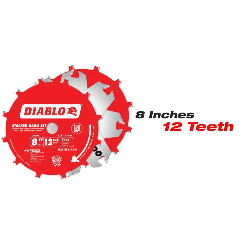 Build bookcases, cabinets, shelving and more with Diablo’s 8 in. x 12-Tooth stacked dado blade set & 10 in. x 60-Tooth fine finish circular saw blade. The dado set makes splinter-free cuts and flat-bottom grooves. It includes a carrying case, two blades, two wing chippers and shims constructed from durable micro-grain titanium carbide for a design that is durable, strong and razor-sharp. Use these blades on 5/8 in. laser-cut arbors for accurate blade rotation. 10 in. x 60 Tooth Fine Finish Carbide Circular Saw Blade features new laser-cut stabilizer vents for precise and clean cuts in a variety of wood materials. The advanced stabilizer vents feature a permanent filler baked in from top to bottom for absorbing noise and preventing sideways movement, allowing the blade to slice through wood cleanly, quickly and accurately while providing up to 5X longer cutting life.