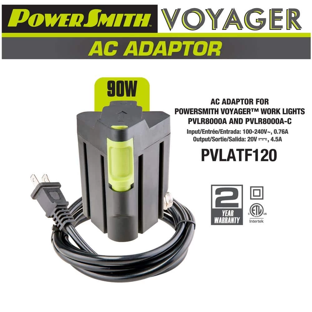 PowerSmith leads the way with Innovative products that serve the lighting needs of consumers and contractor alike. The All New Voyager collapsible tripod 3-Way Power Lighting system also has an AC-DC Transformer that enables users to plug-in their Voyager light directly into a 120-Volt outlet at home, office, or jobsites. The Voyager AC-DC Transformer is equipped with a 6 ft. power cord and is specifically designed for the PowerSmith Voyager Collapsible Tripod LED light system.
