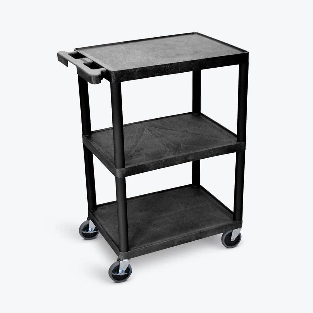 Enjoy enhanced mobility, storage, and durability with the HE34 multipurpose utility cart. 3 sturdy shelves endure the ware and tare of use without ever denting, scratching, or rusting. Whether you need to use a cart to hold audio/visual equipment, as a sturdy storage solution, or as a mobile unit for transporting items, this 3-shelved utility cart will exceed your needs. Built to carry up to 400 lbs., the HE34 lets you smoothly roll even the heaviest of loads from room to room by using its ergonomic push handle and 4 casters, 2 with locking brakes.