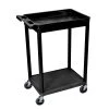 Luxor STC series utility carts are made of high density polyethylene structural foam molded plastic shelves and legs that won’t stain, scratch, dent or rust. Features a retaining lip around the back and sides of flat shelves. Includes 4 heavy duty 4 in. casters, 2 with brake. Has a push handle molded into the top shelf. 24 in. W x 18 in. D shelves. Tub shelves are 2-3/4 in. deep. This Black STC122 cart has a top tub shelf and middle and bottom flat shelves 18 in. D x 24 in. W x 37-1/2 in. H Clearance between shelves is 11-3/4 in. Easy assembly.