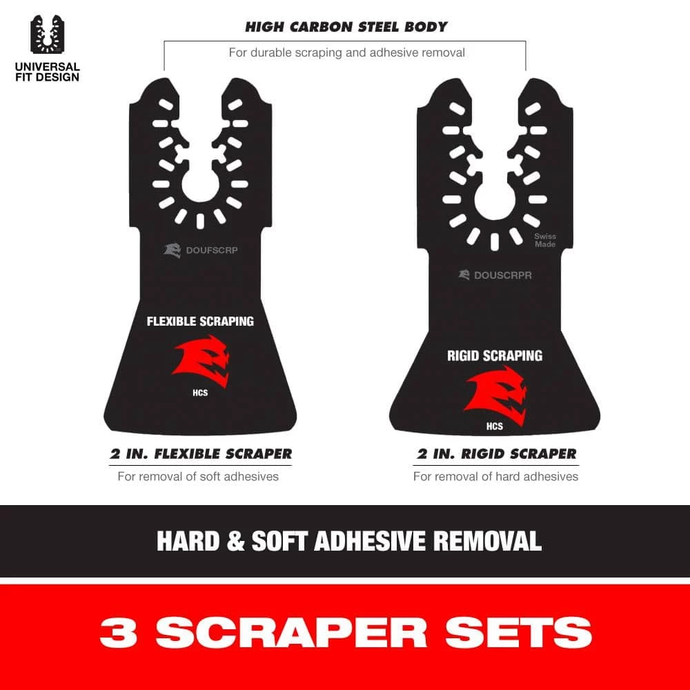 Diablo universal fit high carbon steel oscillating scraper set delivers high-performance removal of soft and hard adhesives, this set includes 2 durable, high carbon steel blades for flexible and ridged scraping. The flexible design removes soft adhesives while the ridge design removes hard adhesives. The unique design of the blade body allows for easy access in hard to reach areas. The blade’s universal fit, adapter-free design easily attaches to most tools, with the exception of Starlock tools.