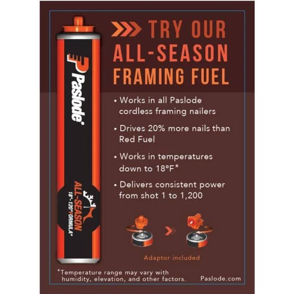 - Replaces Red Framing Fuel (#816000) – for up to 20% more shots/cell, improved performance, All-Season temperature range, and includes an adapter for older models of Paslode framing nailers